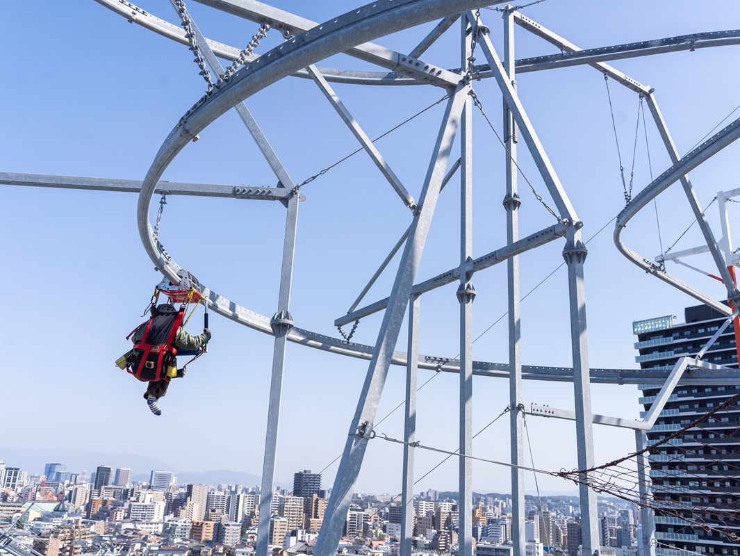 裡面有各種遊樂設施,包括「絕景3兄弟」, 讓人可以從60公尺高的屋頂乘坐單人滑動飛車, 俯瞰福岡市的美景,還有攀岩活動可以體驗。