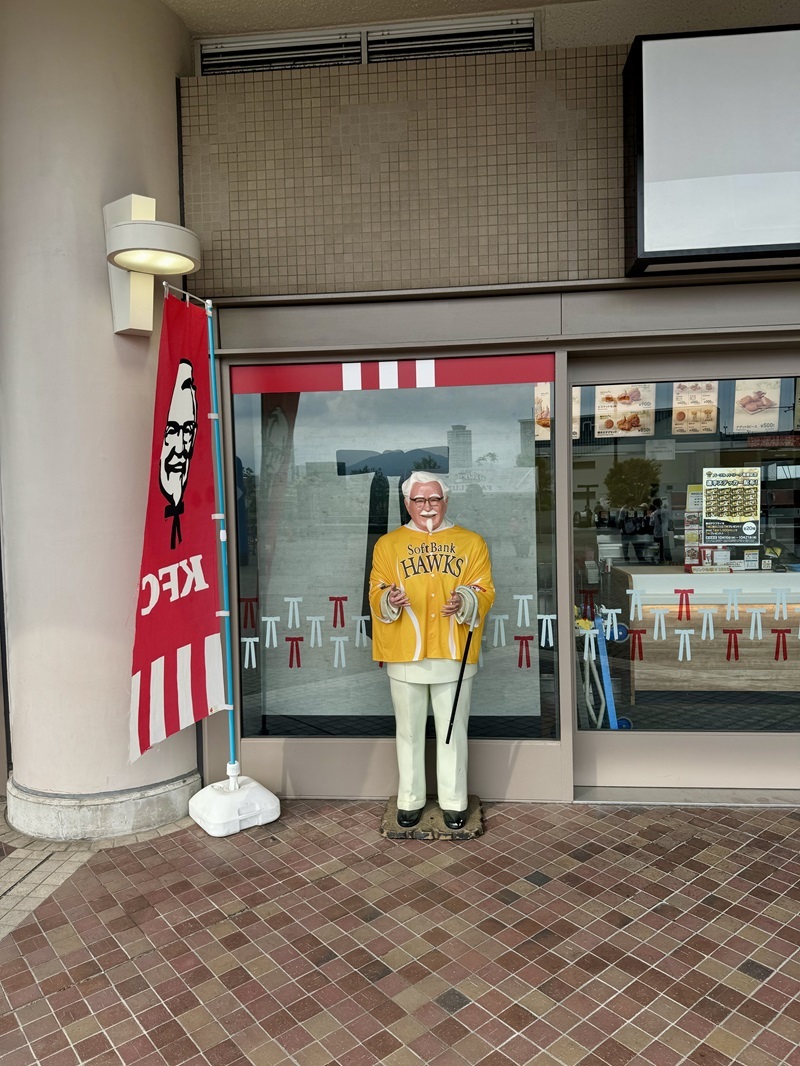 午飯後我們在球場周邊逛了一圈, 看到穿著福岡軟銀鷹隊球衣的肯德基爺爺。