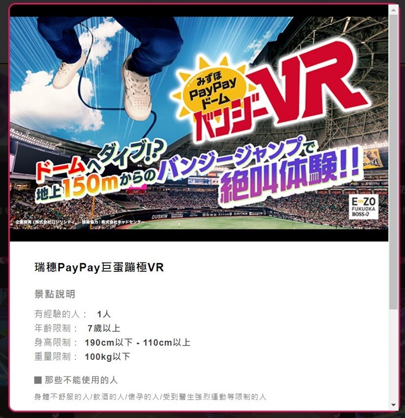 我先體驗福岡巨蛋 Bungee VR, 簡單說明就是戴上VR眼鏡綁在倒立機上, 趴在衝浪板上,像坐雲霄飛車一樣, 一格一格向上爬升到福岡巨蛋頂端, 然後向下俯衝,配合倒立機加電風扇,