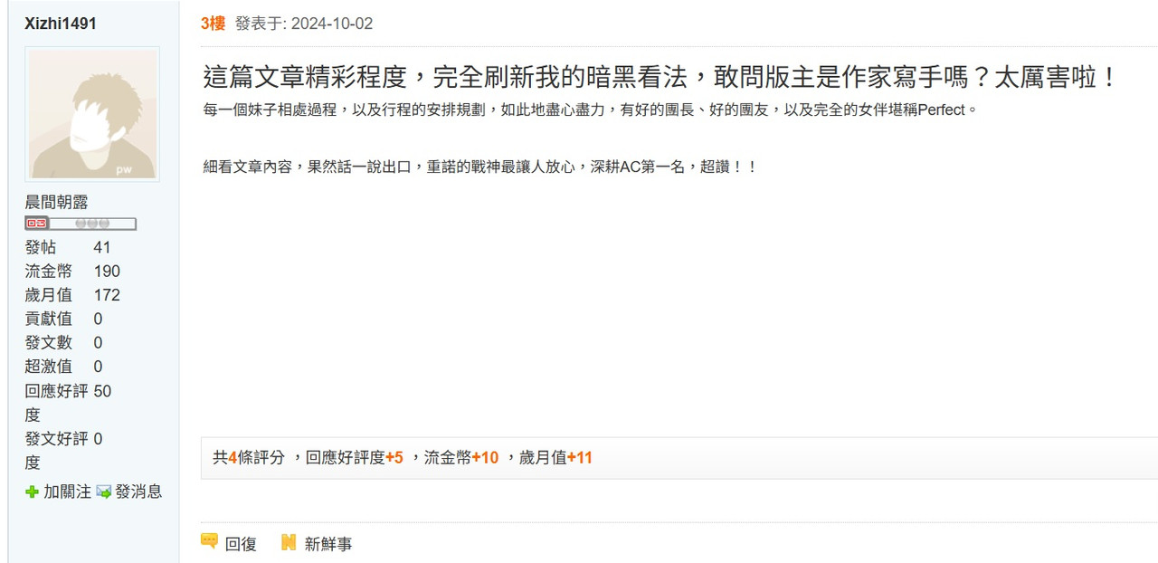 因為這是在戰神的版區貼的文章,廣告商版區有些限制, 不然依照這樣的文章水準,絕對是黃金歲月新人的比賽文章∼