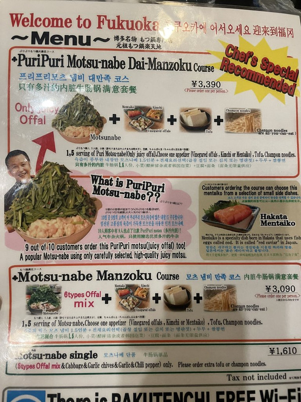 這家拉麵好吃, 但是排隊真的很久, 有些人是說在地人吃的, 觀光客都去一蘭, 到福岡牛腸鍋真的要吃看看。