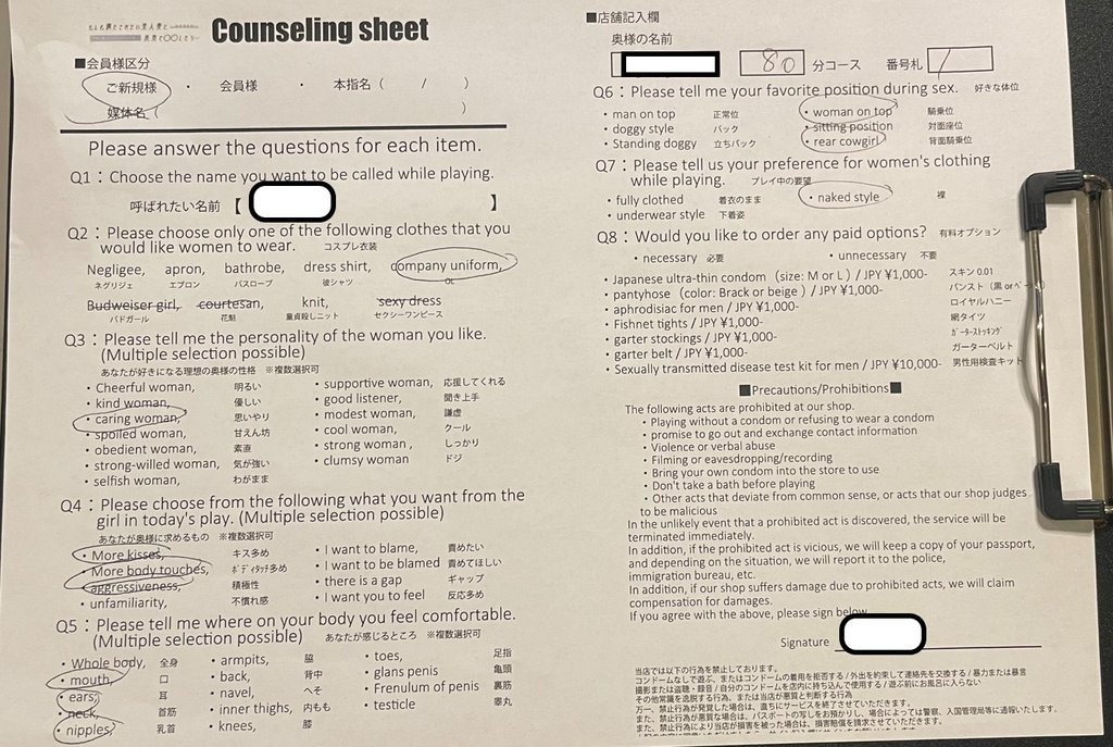 接著服務人員會請你填問卷 先設定你男主角的小名 接著選擇女主角要穿的服裝 今天想要的玩法 詢問你的敏感帶 喜愛的性姿勢 女主角的衣服要 不脫 半脫 全脫 還可以加錢玩絲襪玩法 這對於不會日語的我 真是一大福音