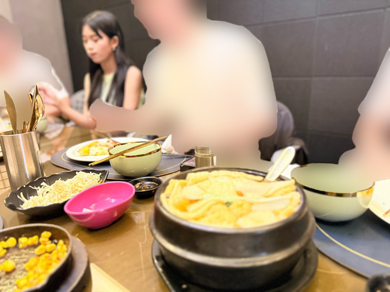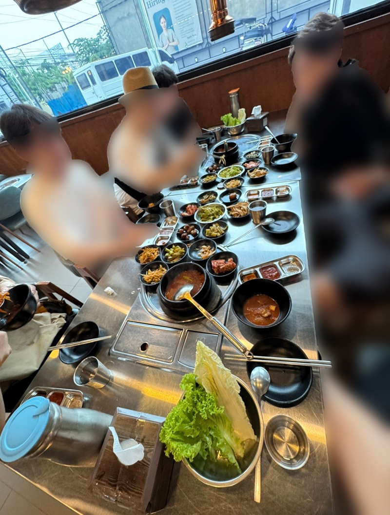 說真的這趟旅程我們這團吃得真的不差 這餐安排的真是豐盛: 牛骨湯、鐵板牛雜、蝦仁炒菜總匯、怪味酸豆湯、奶油蝦仁等等