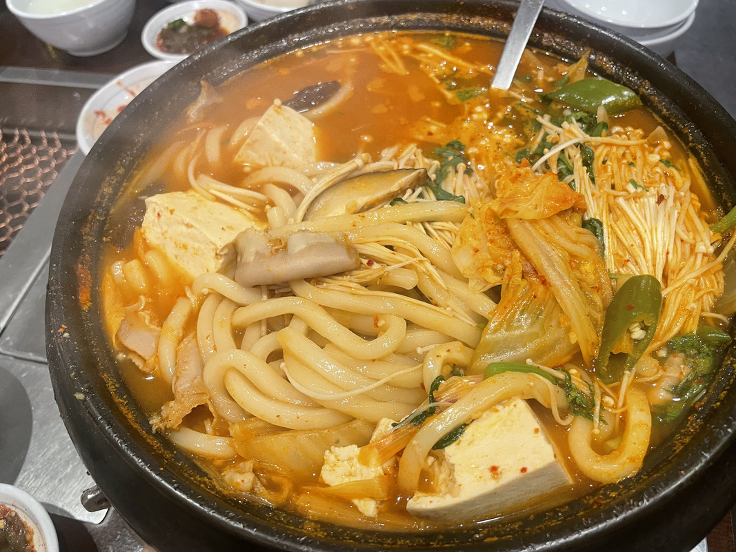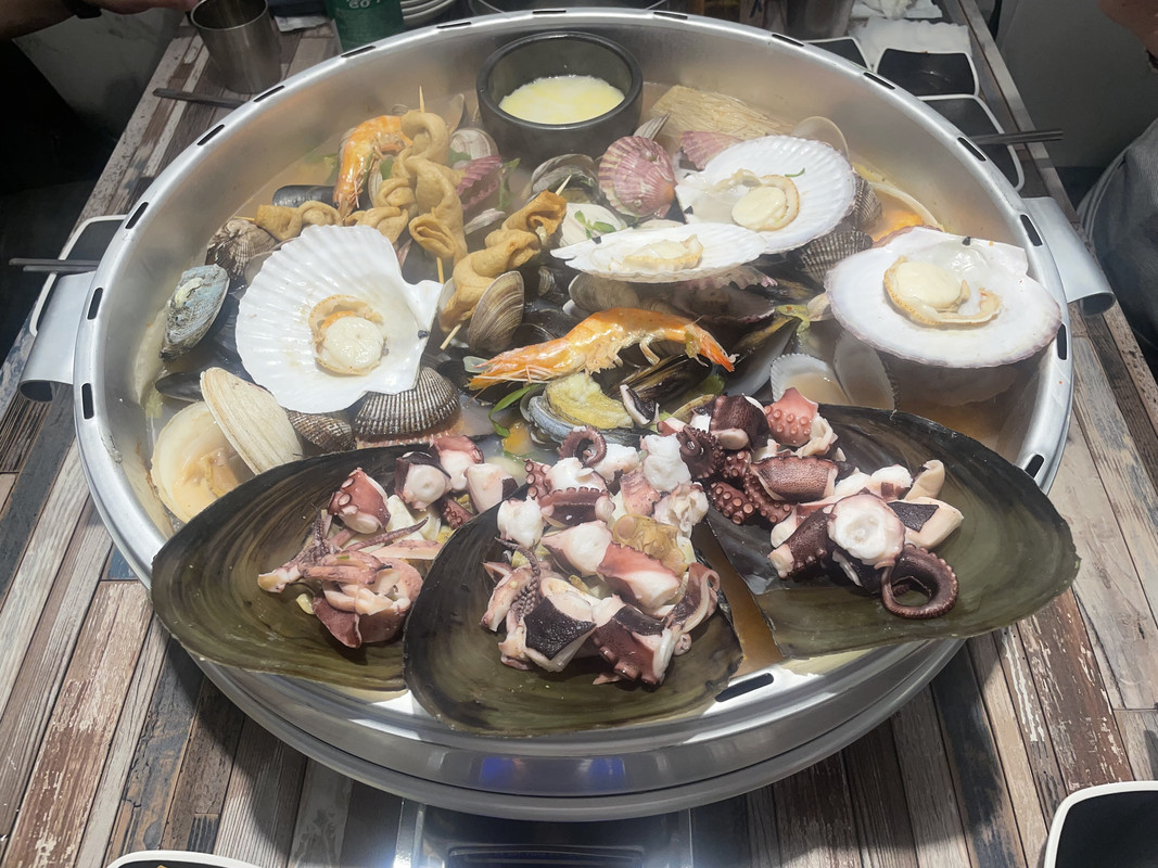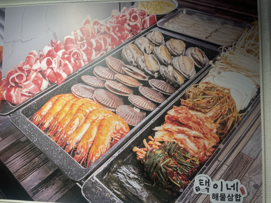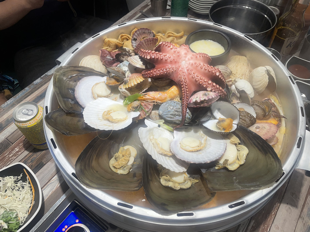 照片裡韓妹的身材真棒!然後那個海鮮跟牛腸火鍋看起來好好吃(肚子又餓了)。