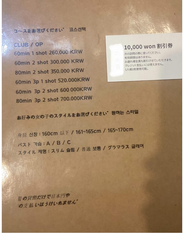 第一晚 戰神帶我們去的這間店 價格比其他店略高 單發35萬韓圓 2發40萬韓圓 不知是這家店是高級店 還是其他的原因… 另外這家店似乎沒有禁止將手機帶進房間裡面