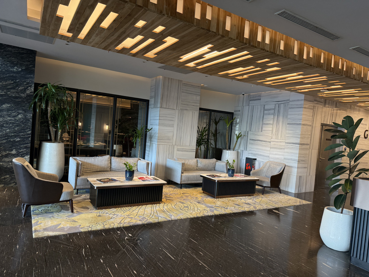 飯店大廳寬敞、設施齊全、 櫃檯服務有中文對應。